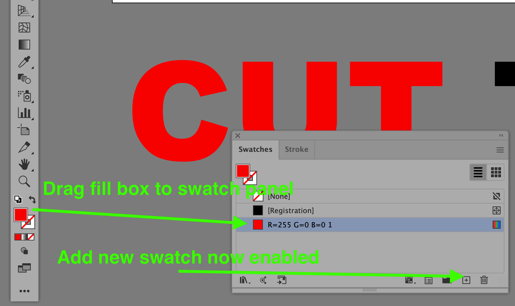 3.) Dragging a fill color box into swatch panel will enable this button. To do this, use the white selection arrow and click on any color in your artwork. Drag the fill color box onto the swatch panel