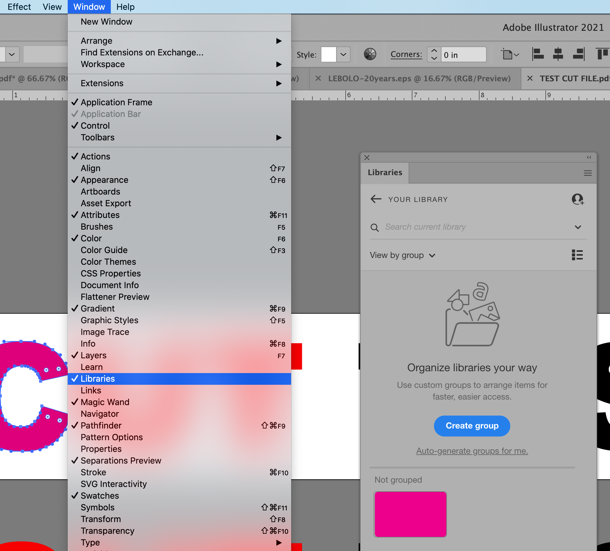 7.) By selecting the "Add to my Library" box Illustrator will add your CutContour swatch to your libraries and will remain there even if Illustrator is completely closed and reopened. To add cutting lines to any future jobs you can simply open the libraries panel by clicking Window>Libraries and skip all above steps.
