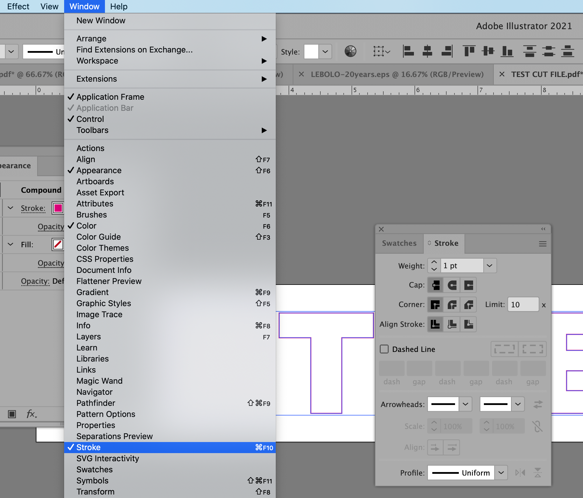 4.) In order for file to cut properly, the stroke alignment must be set to "Center" and the stroke weight must be set to .125pt. To do this open the Stroke panel by clicking "Window>Stroke" on the main menu bar.