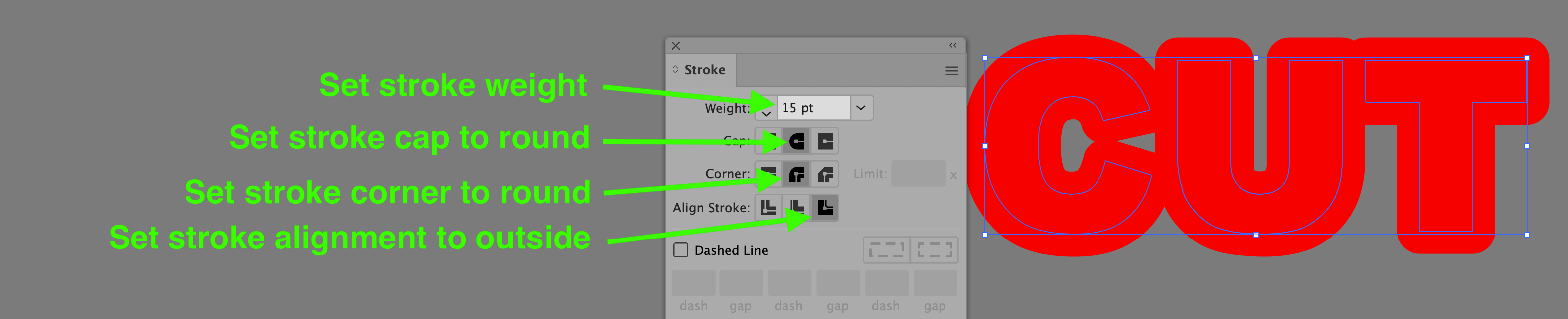 3.) Open your stroke panel by selecting "Window>Stroke from main menu. Align stroke to outer by clicking the align stroke to outer icon. In addition to stroke alignment you will also want to set stroke cap to round and stroke corner to round by clicking on those icons. Increase stroke value until satisfied with result. The value of stroke thickness will vary from file to file, you will want a large enough stroke to compensate for any variance in cutting but not so large that it interferes with other portions of the file. In this example a value of 15pt is sufficient.