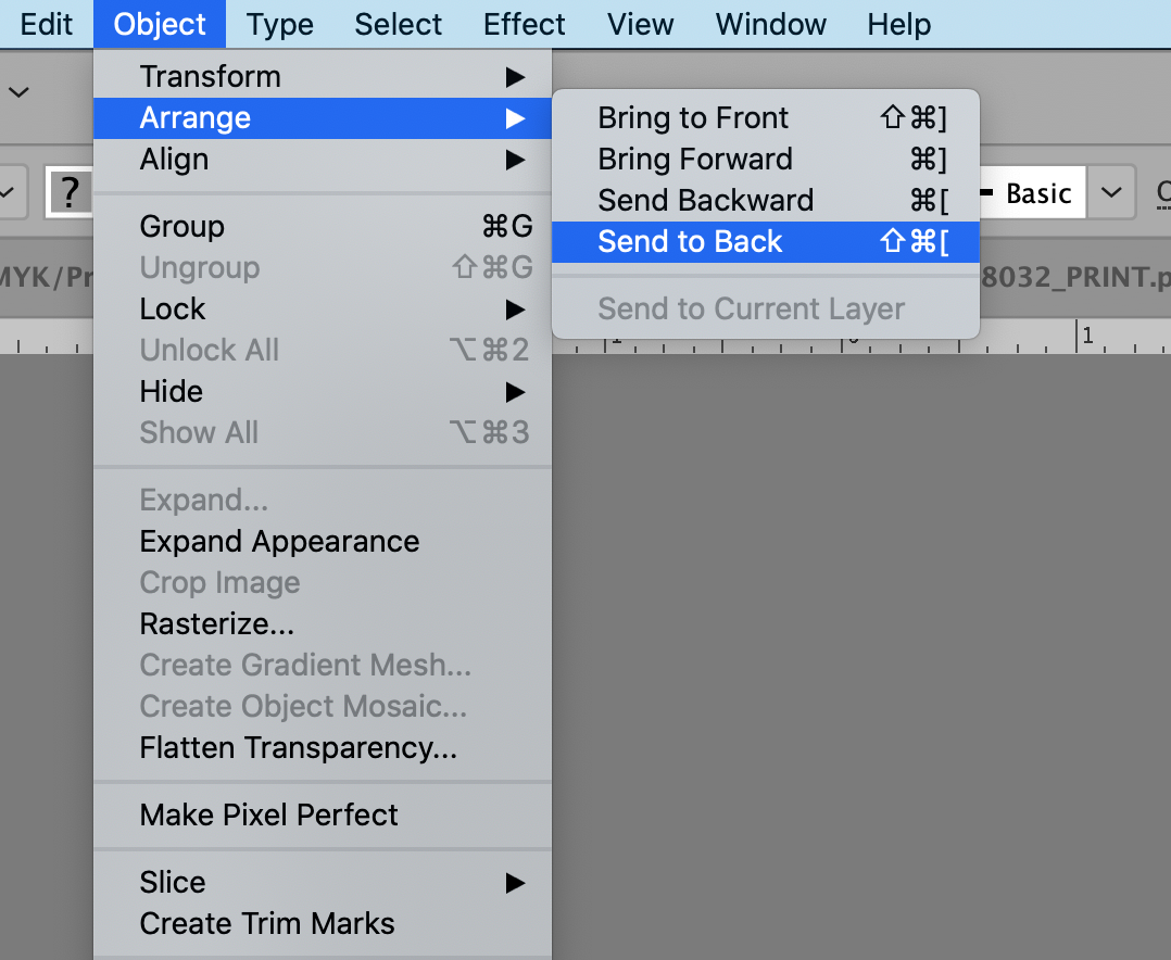 7.) With bleed objects still selected, they will need to be placed behind or "under" the cut lines. To do this select Object>Arrange>Send to back. Alternatively the keyboard shortcut Command+Shift+[ will achieve the same result.