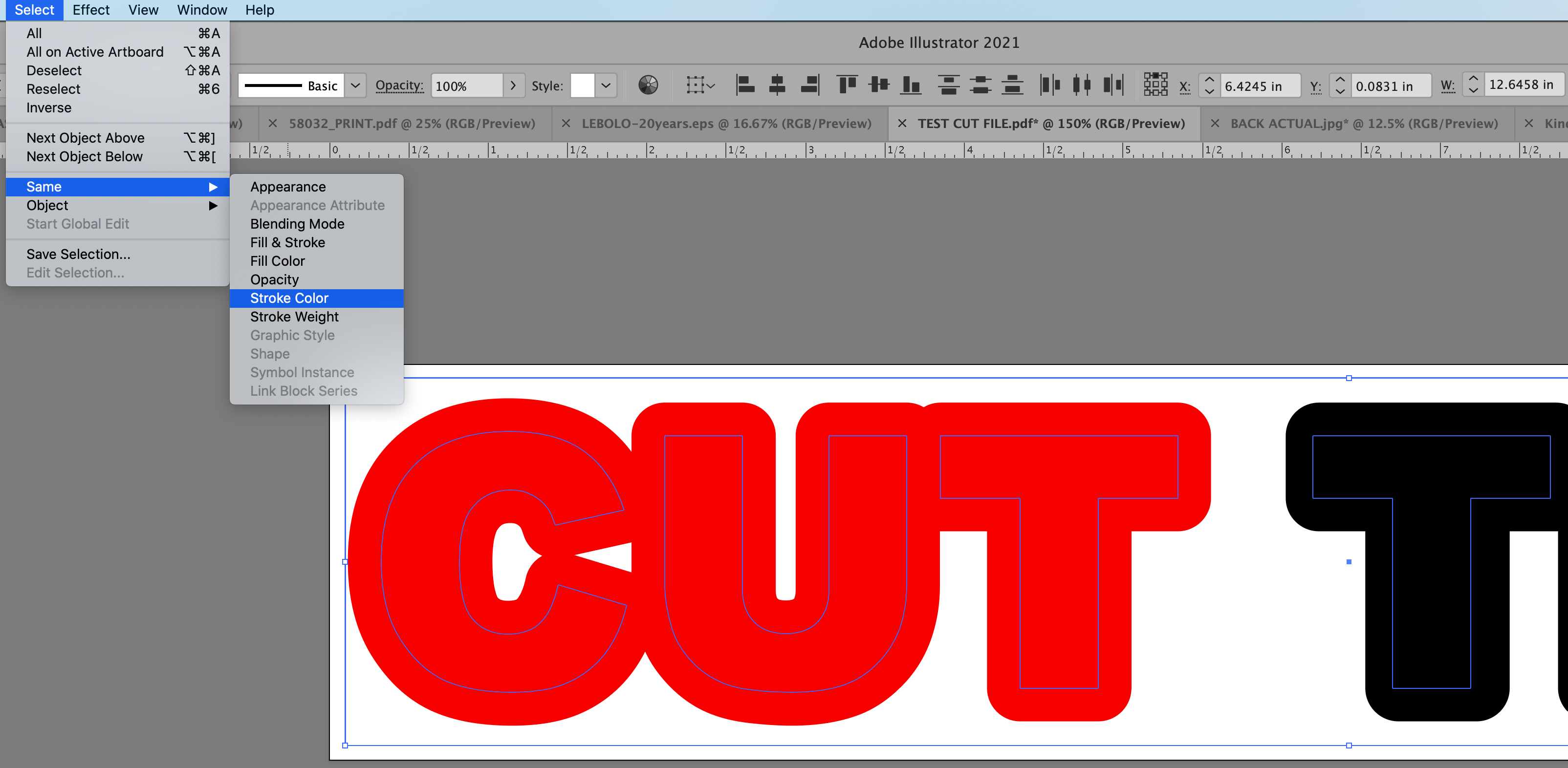 2.) With your rectangle selected we want to select all other cutlines in the file. To do this click "Select>Same>Stroke Color" from main menu bar.