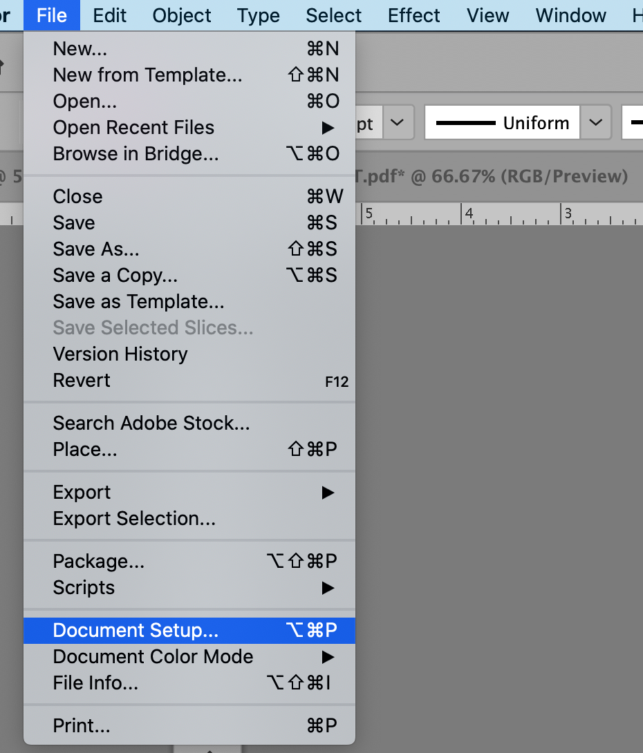 1.) With the above in mind, we will change our artboard size to 51" x 72". To do this click "File>Document Setup" from main menu to launch Document Setup dialog box. Alternatively the keyboard shortcut "Command+Option+P will achieve same result.