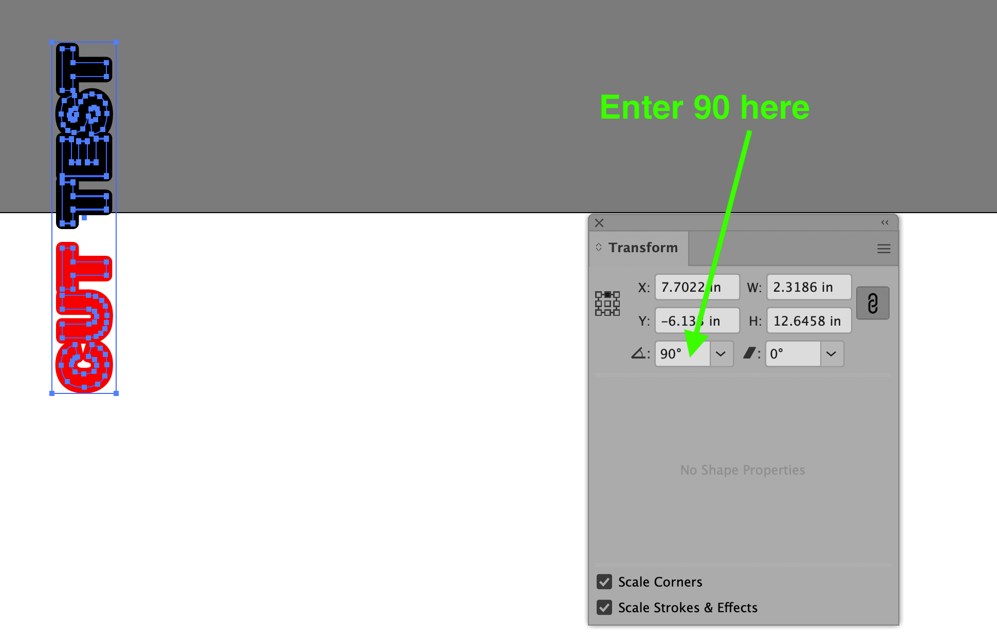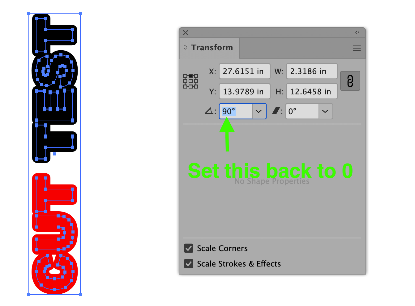 14.) With object still selected, re launch your transform tool panel if it is not already open by clicking "Window>Transform" in main menu. You'll notice there is still a value of 90 in the rotation field, we'll set that back to 0
