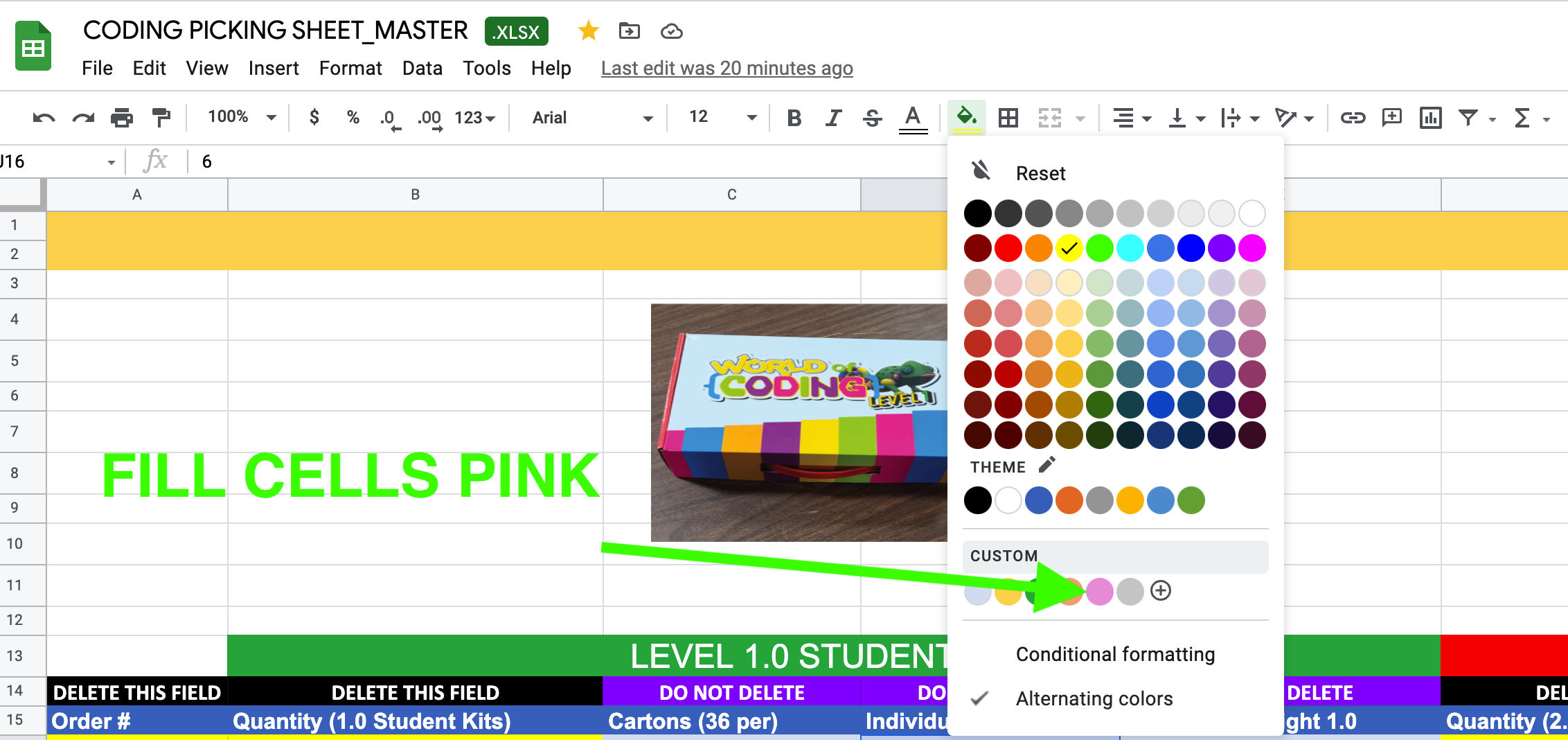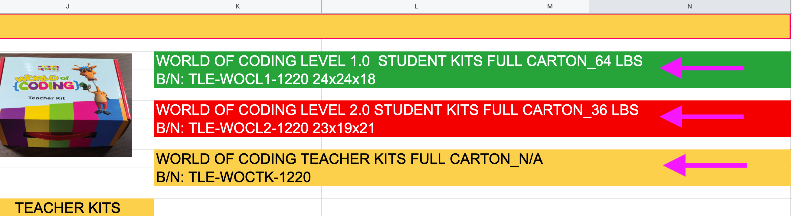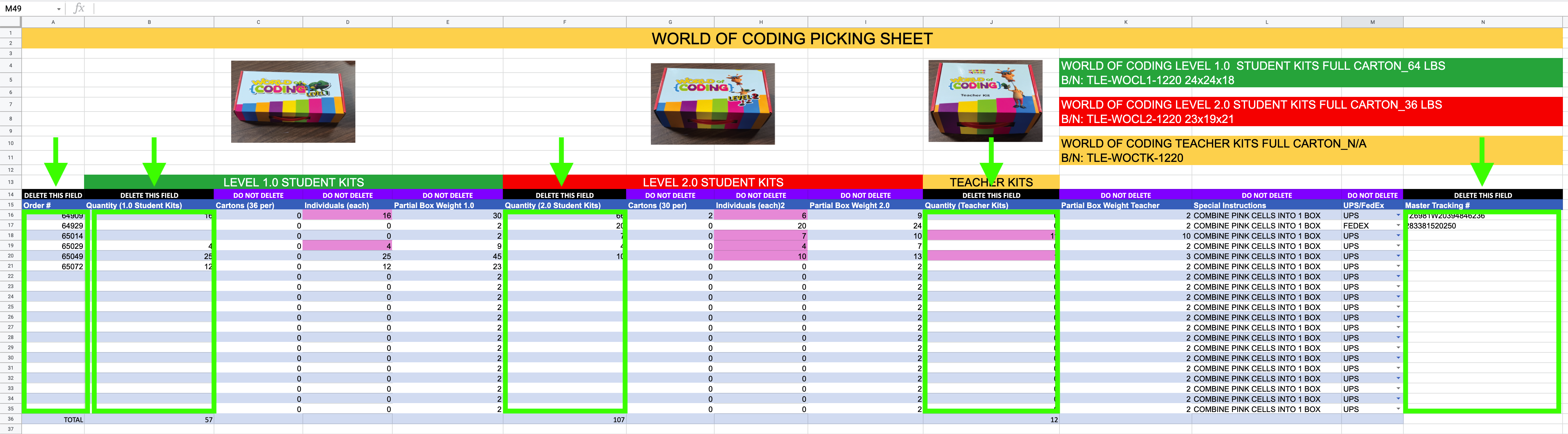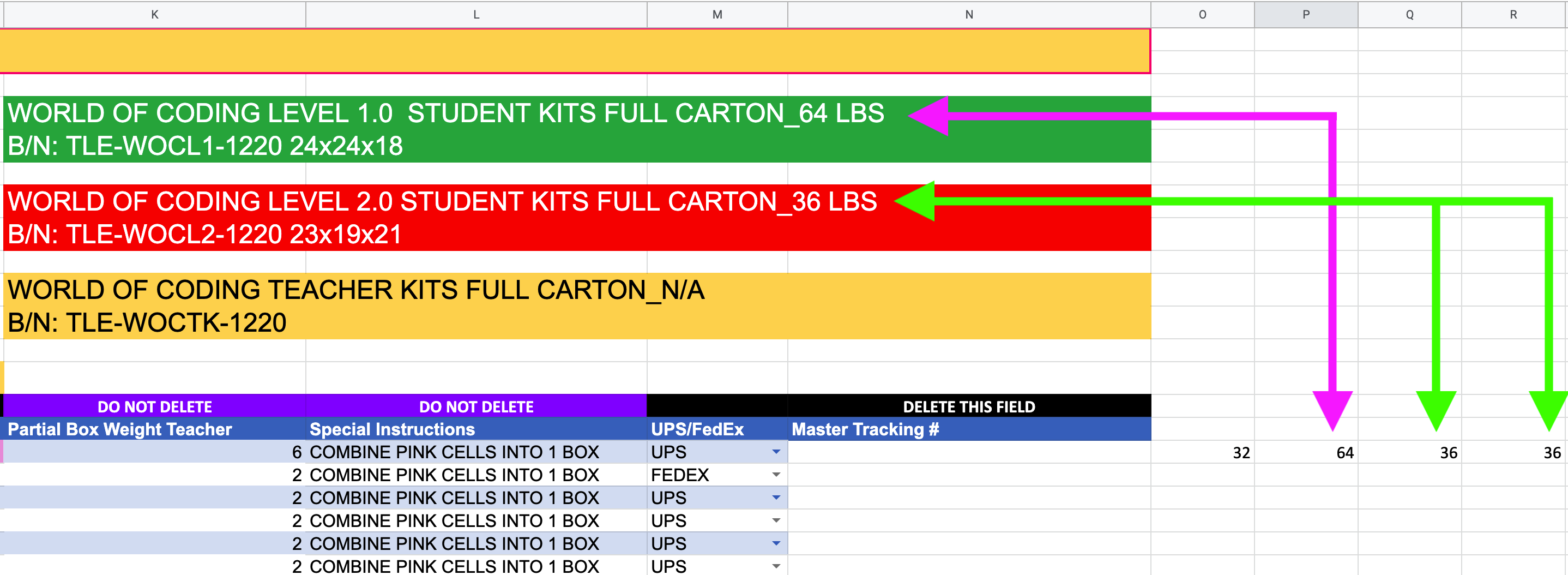 We will now need to combine boxes where applicable. Note that Level 1.0 have 36 kits per carton and Level 2.0 kits have 30 kits per carton. This means that a minimum of 30 kits will fit in a carton even if it is a combination of 1.0 and 2.0 kits. You will need to view each line of the google sheet once filled out and determine where items can be combined into 1 box and fill those fields pink. Looking at our "Individuals" columns in this example we see that there are 14 individual 1.0 kits, 0 individual 2.0 kits and 6 teacher kits. In this example we would combine the 14 1.0 kits with the 6 teacher kits into one box by changing the fill of those cells to pink. See example below.