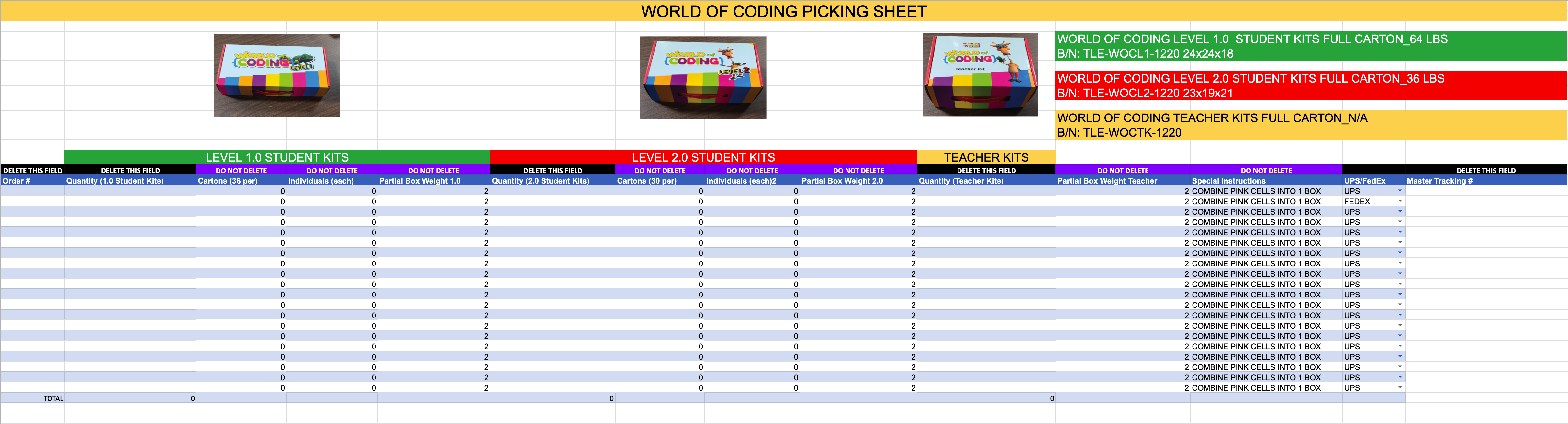 Repeat step 7 for all full cartons. In this example we have 1 full carton of Level 1.0 kits and 2 full cartons of Level 2.0 kits. All full cartons weights are located in the upper right of the google sheet.