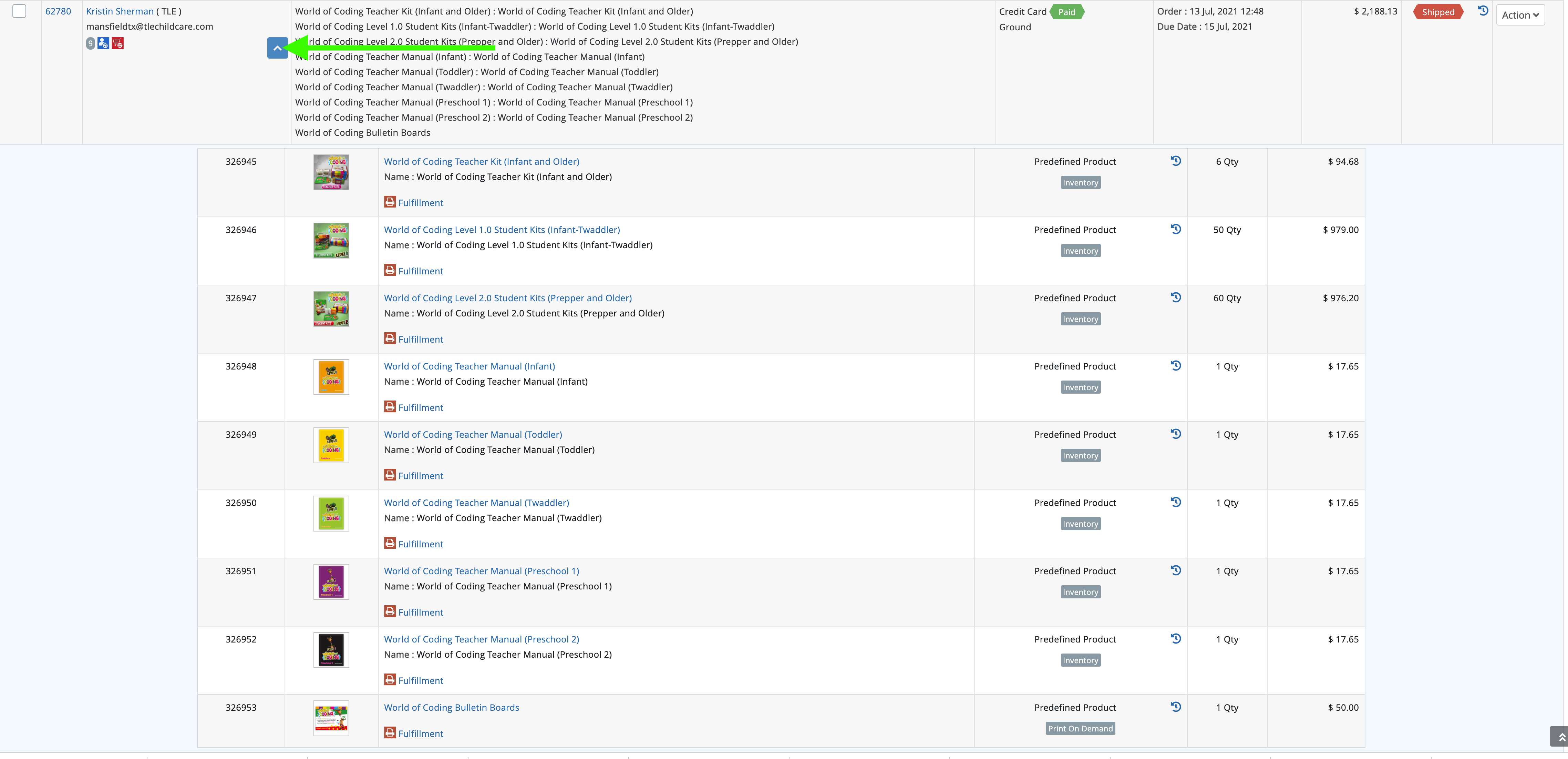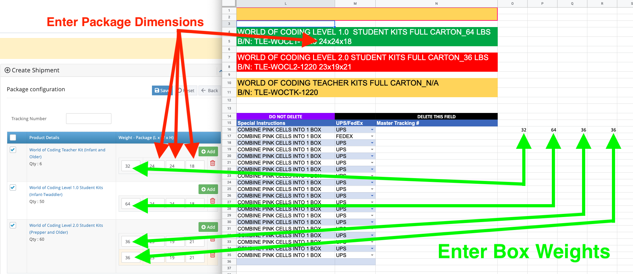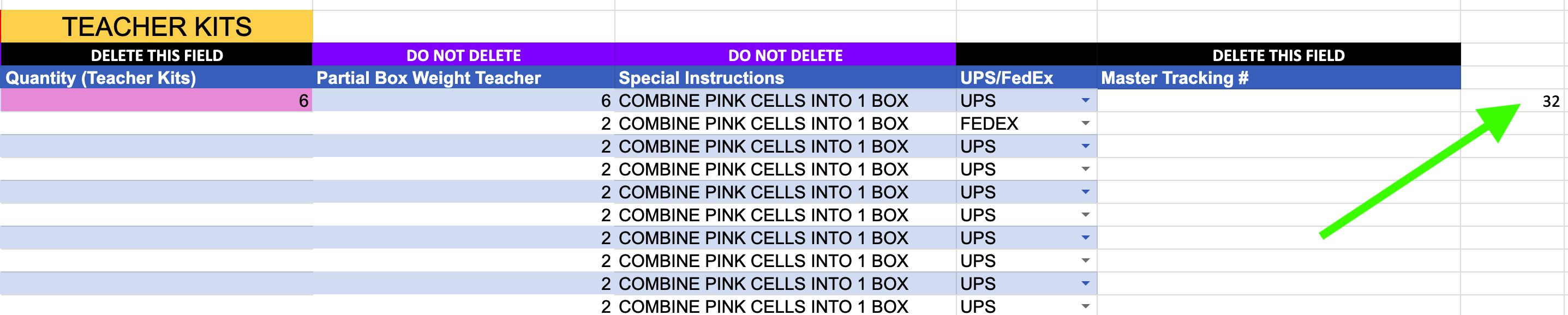 We will now need to generate shipping labels per order. The built in formulas are generating box weights for the individual kits but we will need to combine these weights wherever we combined boxes. In this example we have combined the individual kits for 1.0 with the teacher kits so we will add those 2 box weights together. See example below: