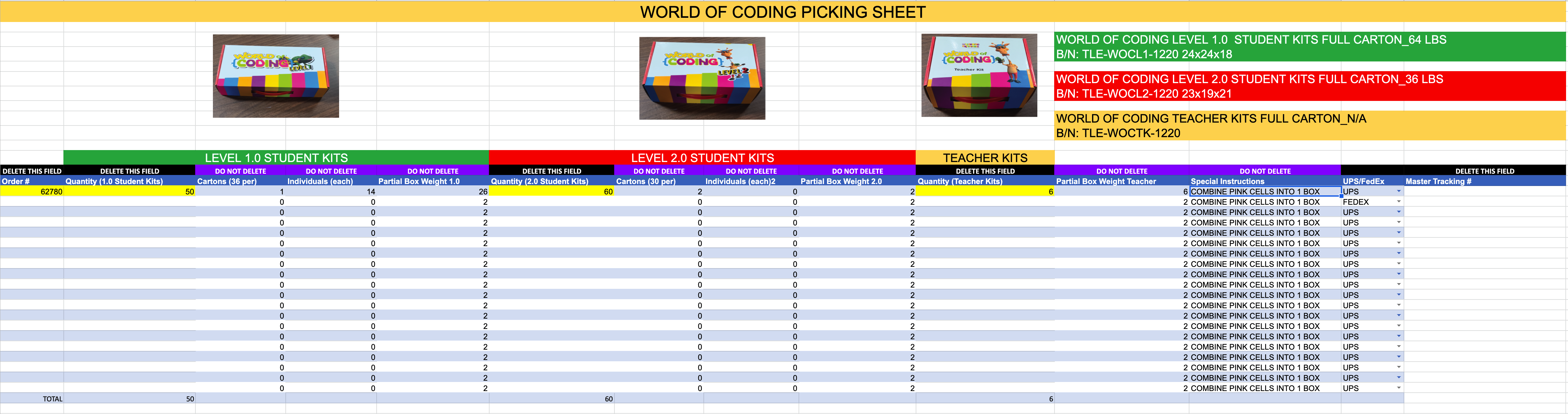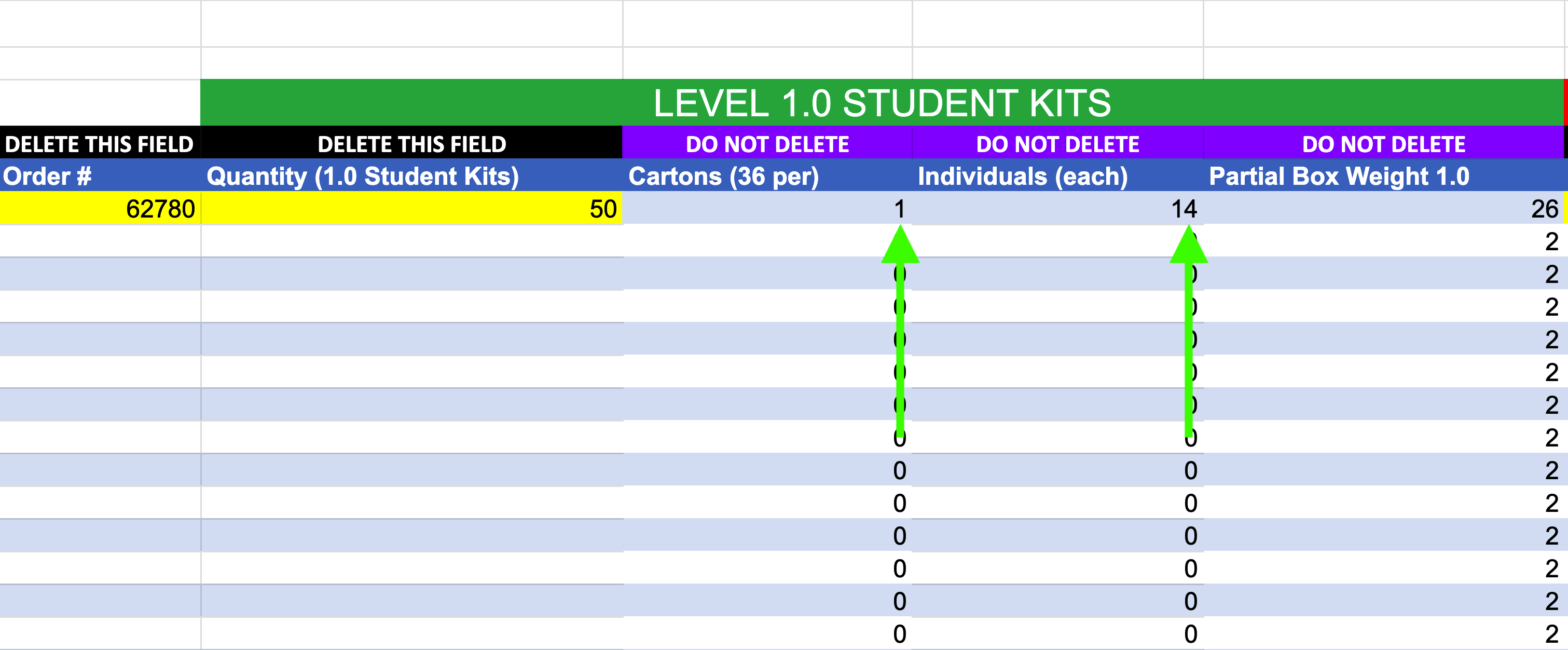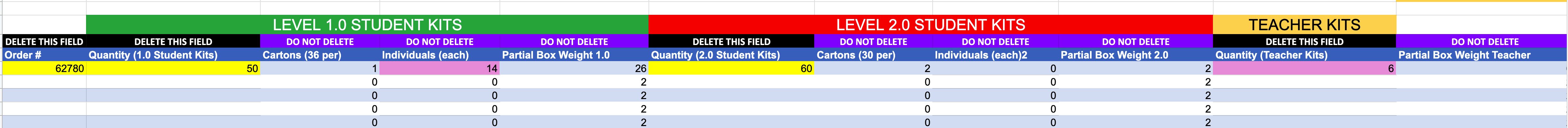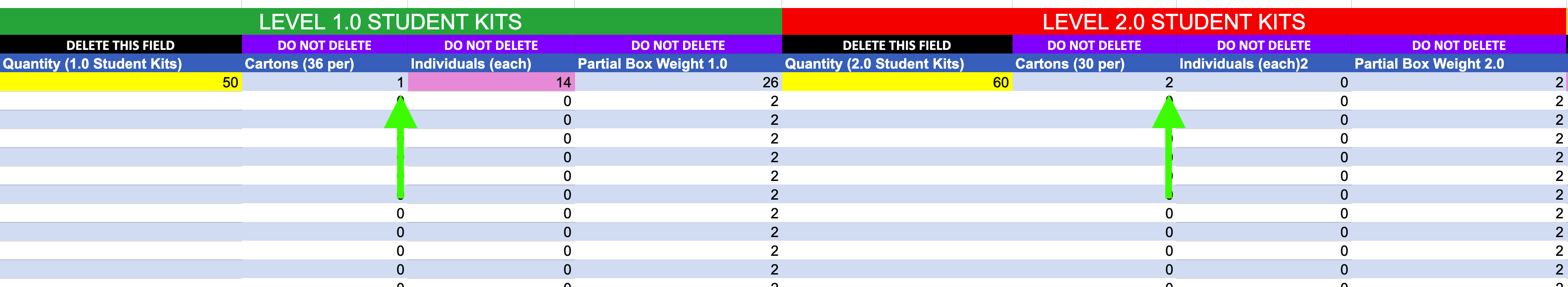 The google sheet has built in math formulas that will calculate how many full cartons will be needed as well as how many individual kits are left over after full cartons are calculated. In the below example, there are 36 Level 1.0 Kits in a full carton and the center has ordered 50. Notice that the built in formulas are calculating 1 full carton of 36 and 14 additional individual kits for a total of 50.