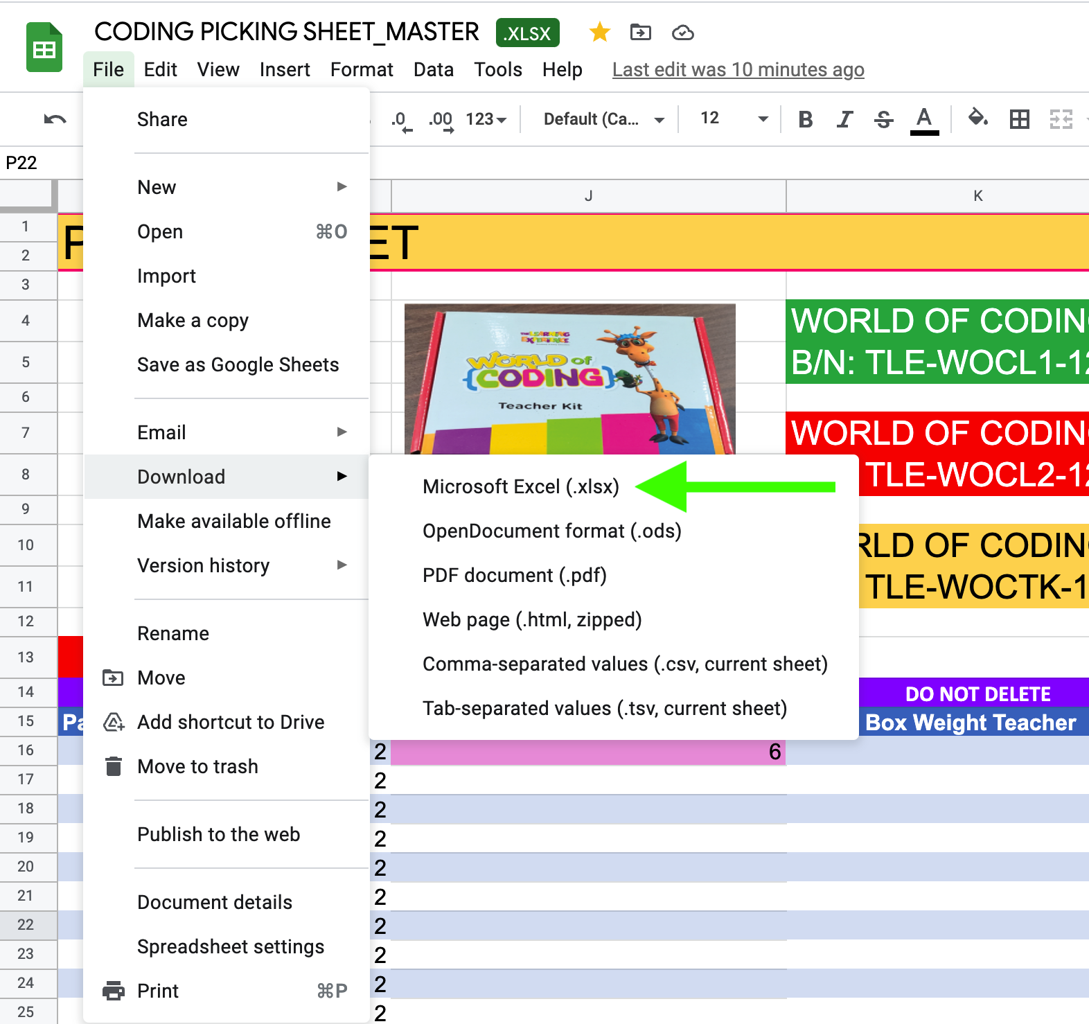 At this point, we have calculated the number of boxes this order will require is 4, (1 full carton of 1.0 kits, 2 full cartons of 2.0 kits and the combined box of 1.0 and teacher kits) as well as the weights of those boxes. Repeat all above steps for any remaining open orders requiring these kits and export the document as an ".xlsx" file.