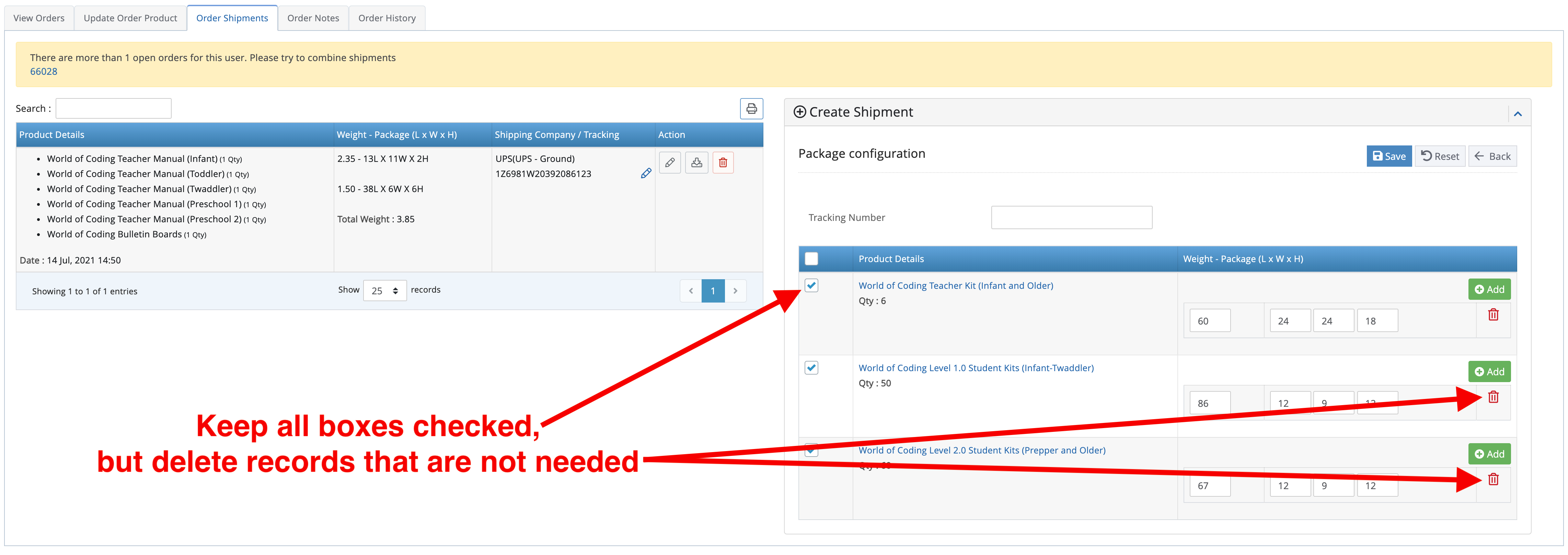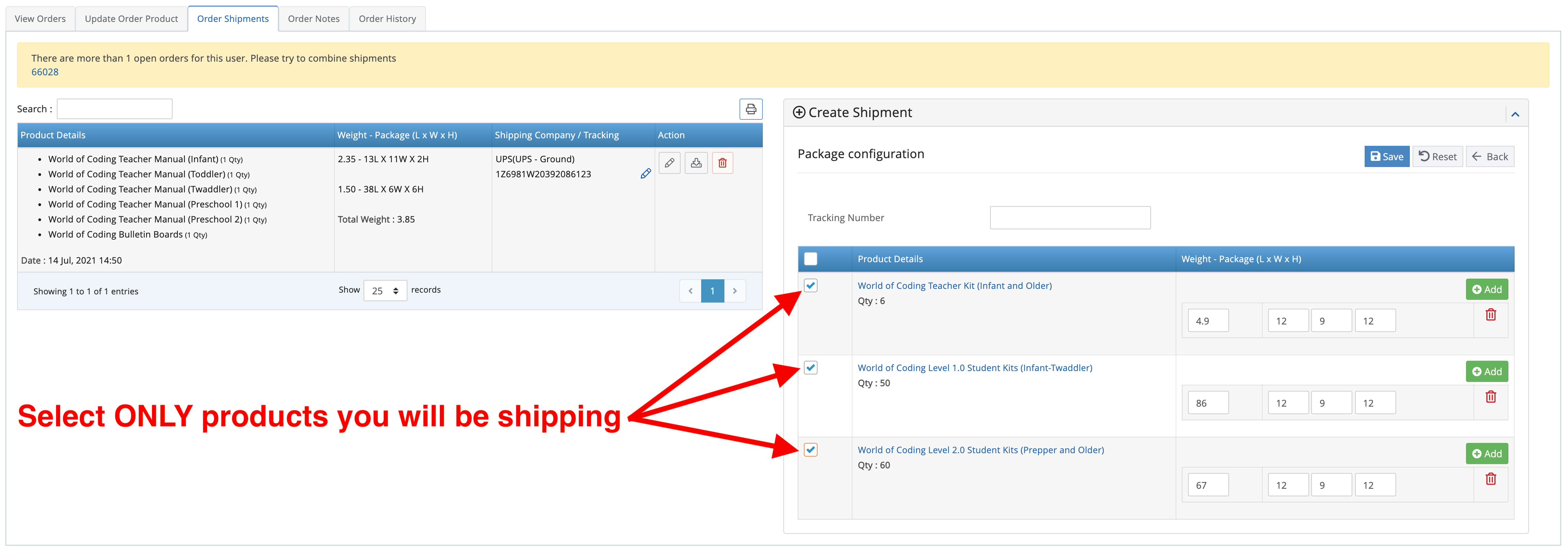 If you have multiple products that can fit into 1 box, you must click on the checkbox but delete the shipping label. For this example, assume all Teacher kits and Student kits can fit in 1 60lb box. You will click on all checkboxes for the products you are shipping, enter 60lb weight and box dimensions on one of the products and delete the other 2. See below: