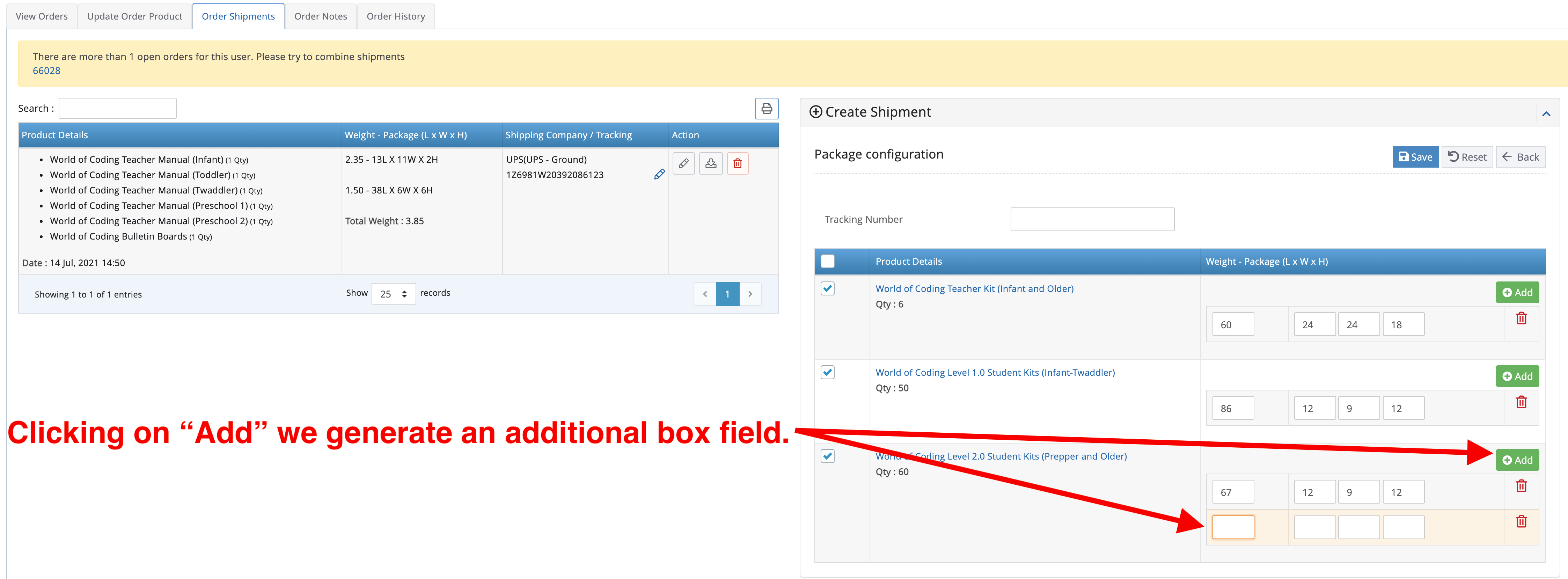 If the number of boxes you need to generate exceeds the available boxes you have on the backend, you can add boxes accordingly by clicking on "Add" button. In our example from above steps, we calculated 4 boxes but on the backend we are only given 3. We can add another box by clicking "Add". Which product you click "Add" on is not important.