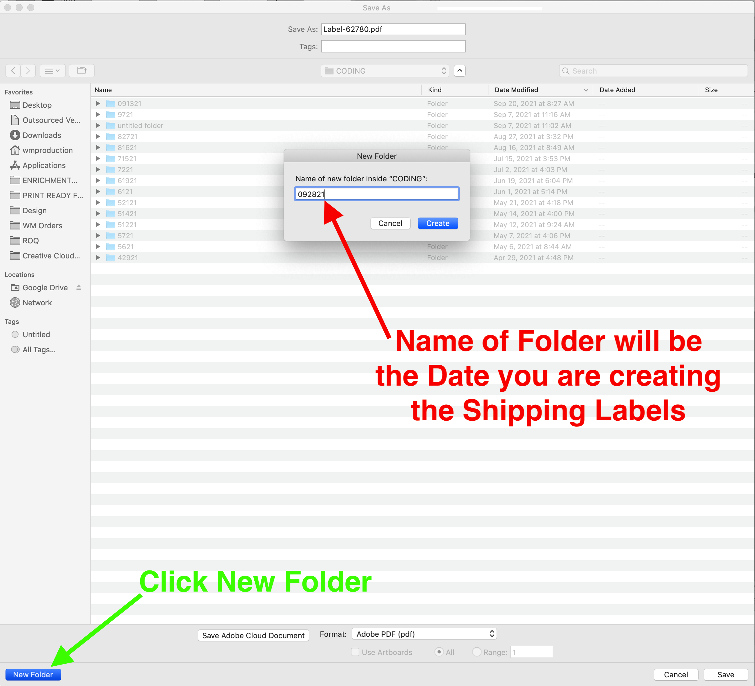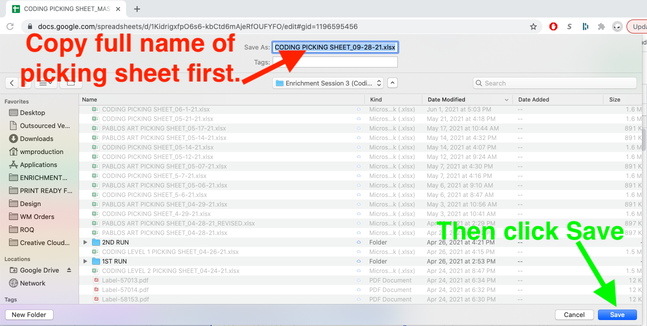 Save the file with the current file name template ("PROGRAM NAME" "PICKING SHEET"_Date.xlsx) In this example we will use "CODING PICKING SHEET_09-28-21.xlsx". Before clicking "Save" copy the full name of the file to your clipboard