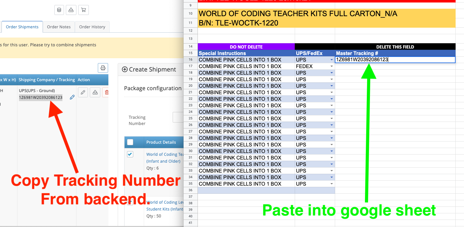 Once you have successfully saved the shipping label in the proper folder, you will need to copy the tracking number and enter it into the google picking sheet. To do this, copy the full tracking number from the backend and paste it into the corresponding Master Tracking field in the google document: