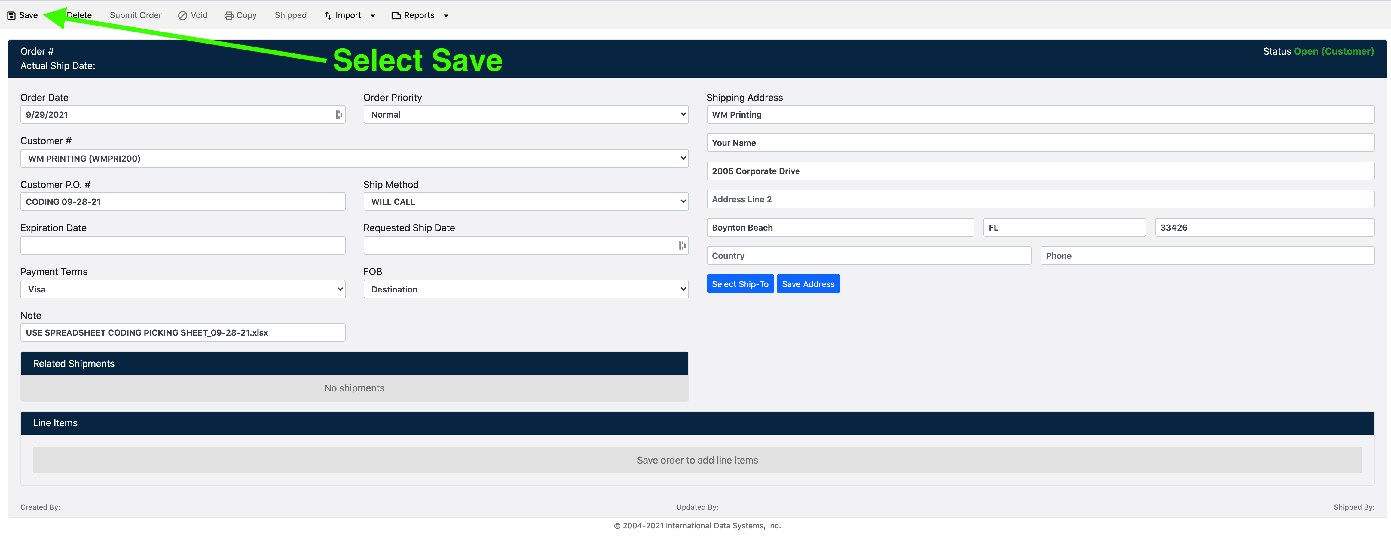 Add items to remove stock from Fulfillment World Inventory. After all fields have been filled out from the New Order screen, select Save to save the order details.