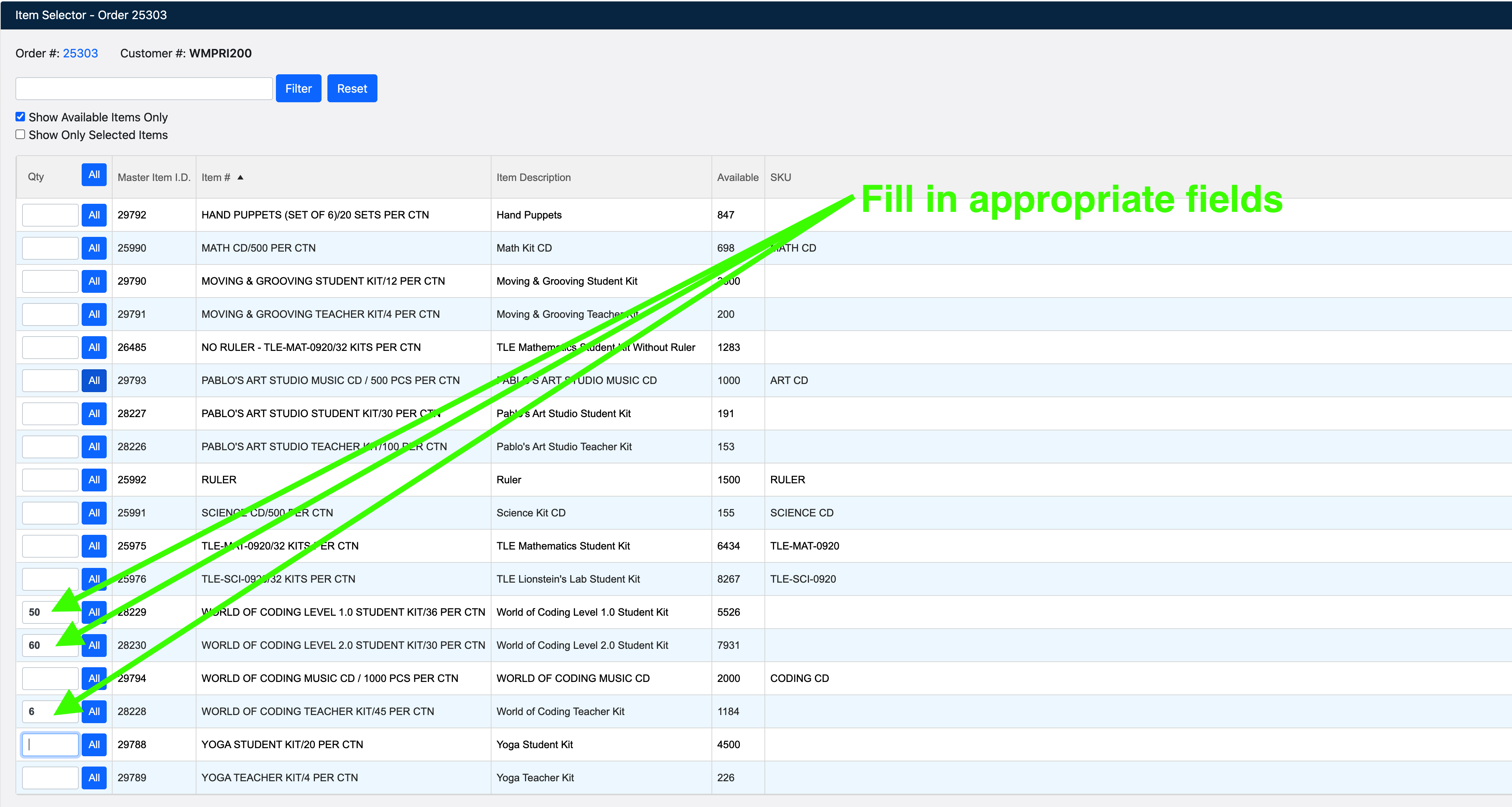 From the Item Selector screen, fill out the appropriate information depending on the products you wish to ship. In our example from previous steps we need to ship 50 Level 1.0 kits, 60 Level 2.0 kits and 6 Teacher kits. Once all fields are filled out, select Add Items to Order.