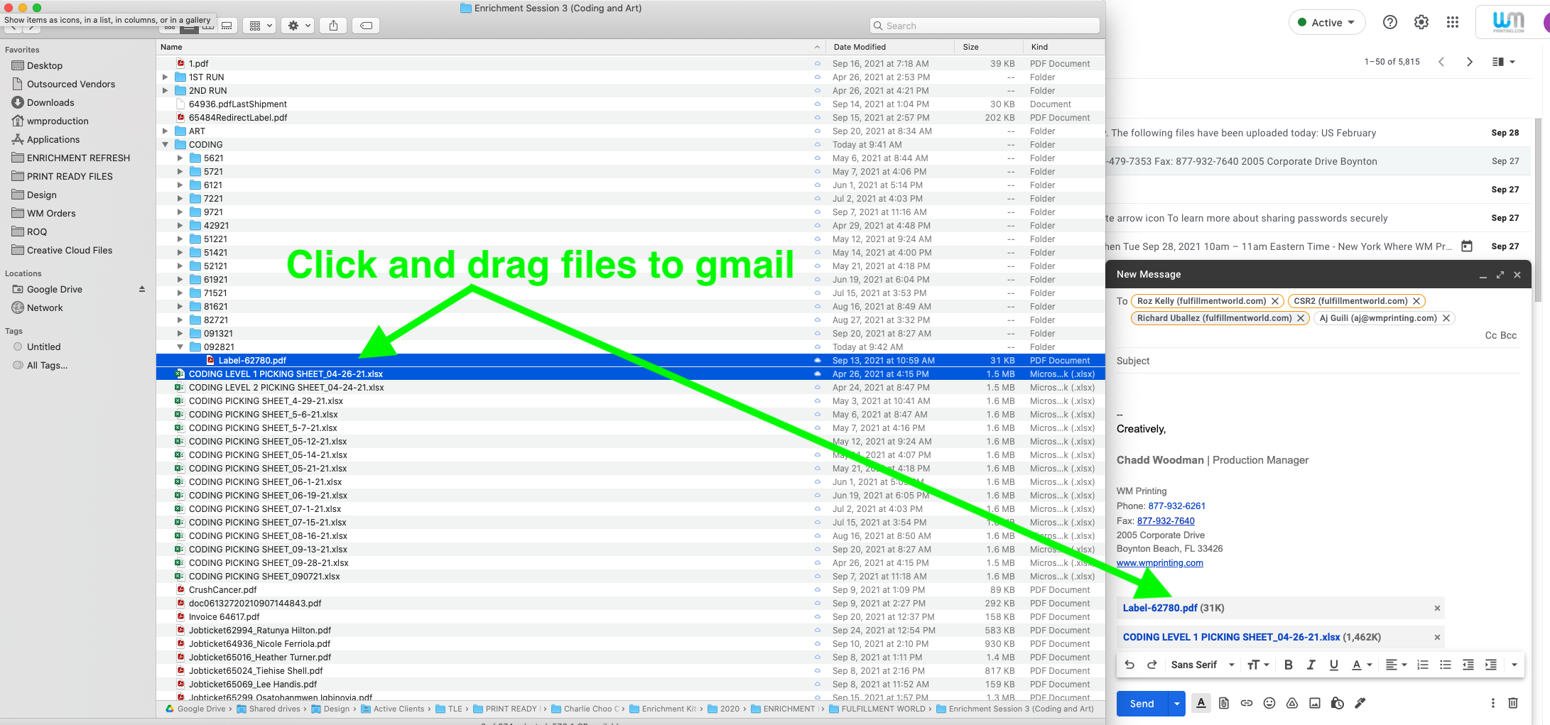 Open finder and navigate to the appropriate folder where we have saved the excel sheet and shipping labels. Collapse the folders that contain the shipping labels. With shipping labels and excel sheet visible, hold Command and click on all appropriate files and drag them onto the Compose window in gmail.